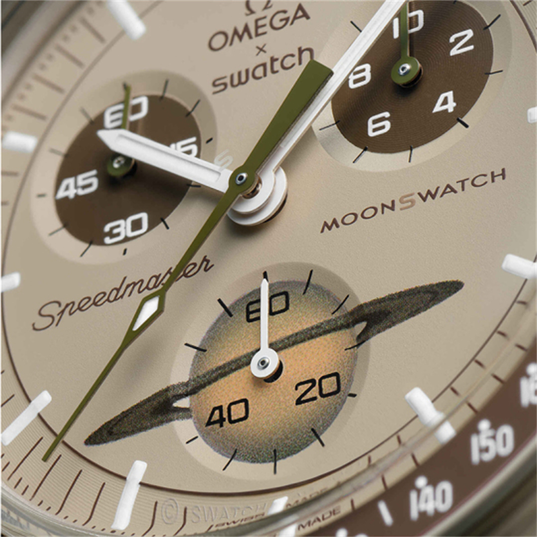 このモデルでは、サンドベージュのトーンがブラウンの文字盤やVELCROストラップと見事なコントラストをなしています。クロノグラフの秒針、サブダイアルの針、タキメーターの目盛の背景もブラウン。秒のサブダイアルには土星の環が描かれています。 すべての文字盤には、OMEGA X SWATCHの文字、アイコニックなSpeedmasterのロゴ、そして新しいMoonSwatchのロゴが見られます。ガラス構造にはクリスタルの中央に隠れたSの字が統合。文字盤の外側のリングとサブダイアルには繊細で洗練された円の模様、シャープでスムーズなラグ構造、タキメーターの目盛が付いたベゼルにはアイコニックな「ドットオーバー90」のディテール、そしてもちろんユニークなBioceramicのタッチ。これらが全モデルに共通で、ディテールを愛する情熱を表わしています。すべての時針、分針、クロノグラフの秒針、そして時間のマーカーにスーパールミノバが施されているので、暗闇でパーフェクトに光ります。